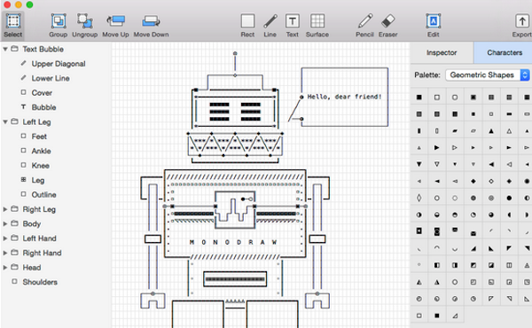 Monodraw是一款文本图像编辑器,用户可以使用鼠标、手绘笔等工具在软件的方格画布中作图,利用软件强大的编辑工具快速生成满意的文本图像。因为是文本图像,所以可以任意的拷贝到TXT编辑器、电子邮件等等不能直接插入图片的环境中。甚至在一些无法显示图片的终端,如打字机、电传打字机等设备上,Monodraw作出的文本图像理论上都可以显示、应用在上面。