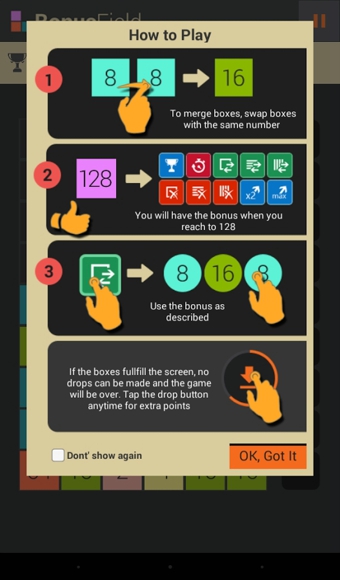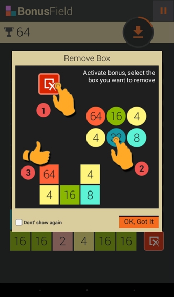 《BonusField》是一个具有挑战性的益智游戏,简单的游戏。我们的目标是消除块之前的时间到了。横扫(上,下,左,右)以移动框。当两个框具有相同数目的触摸,它们合并成一个。结合同一箱和并合并成最大值,并且解锁10个独特的奖金。奖金是关键因素,游戏的交换箱,取出盒和更改号码。