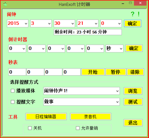 HanExoft计时器是一款多功能的计时器,提供闹钟 、秒表、定时器、日程编辑器和录音机等功能,当把软件作闹钟使用时,有文字或者音乐两种方式提醒方式,其中闹铃支持自定义音乐文件【HanExoft计时器 功能说明】