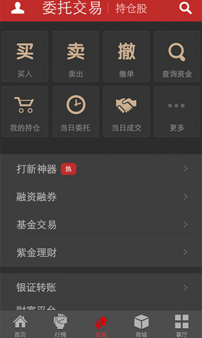 3、交易:买入、卖出、撤单、查询资金、我的持仓、当日委托、当日成交