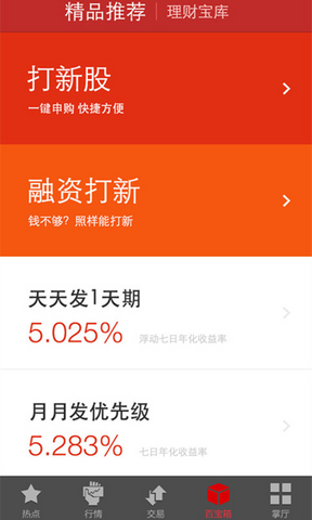 1、百宝箱:精品推荐、理财宝库、明星产品,每日收益看涨跌。