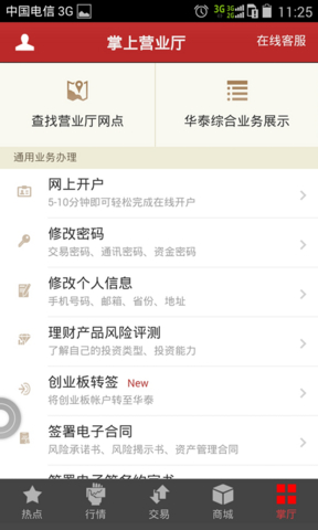 4、掌上营业厅:查找营业厅网点、网上开户、修改密码、修改个人信息、融资融券开户、开通港股通