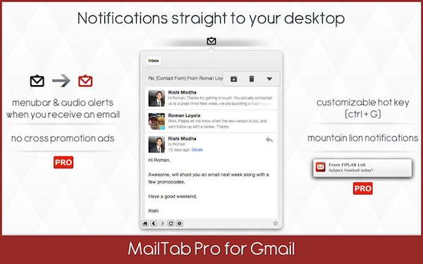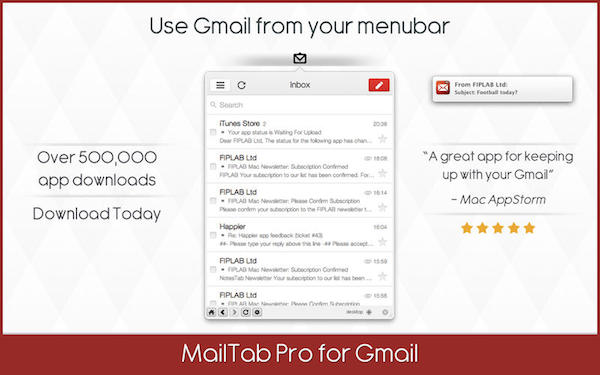 MailTab Pro For Gmail Mac版是Mac os平台上的一款非常实用的Mac邮件客户端,MailTab Pro For Gmail Mac版是专为 Gmail 打造的浏览器小窗口。菜单栏弹出式设计收缩自如,邮箱的查收时间、新邮件通知方式皆可订制,搜索快捷回复等功能一应俱全。