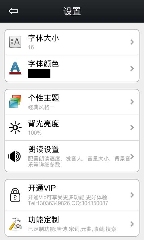 5.提供功能定制,字号,文字颜色,应用程序主题,背景亮度设置等个性化配置功能。