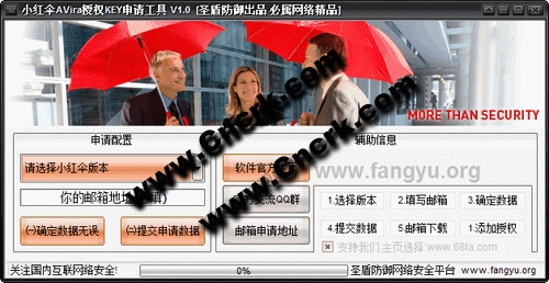 圣盾防御小红伞AVira授权KEY申请工具可免费申请到C版、S版、P版、专业版的KEY文件。使用方法:选择小红伞的版本--输入邮箱--点击“确定数据无误”--然后网页加载成功后,点击“提交申请数据”--申请成功会程序会提示。