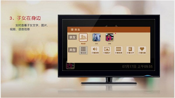 1 与云家信·传相互配合使用的家庭应用;2.分享亲友图片、视频、语音互动、语音留言、文字信息;