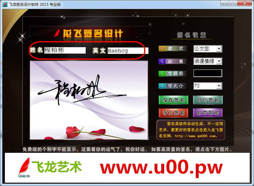 3、以往的签名软件生成的名字是单独的字,龙飞签名软件生成的是互连的字。