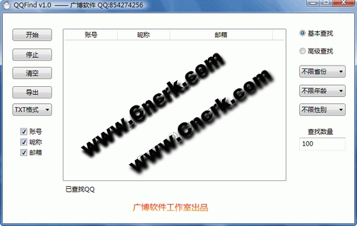 QQFind 可以自动搜索在线QQ用户,并可把搜索到的用户号码,昵称和邮箱等内容导出供其他软件调用!