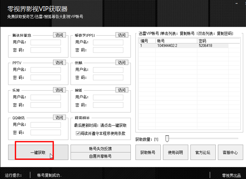 影视VIP获取器是零视界出品的全新全能型VIP会员获取工具。该工具可以帮助用户获取爱奇艺、腾讯好莱坞、搜狐视频、迅雷、乐事、优酷等视频网站的VIP账号,它占用资源小,播放还无广告,还用户一个纯洁的视频播放环境。