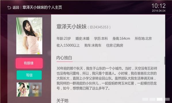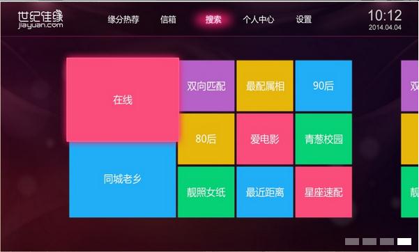 世纪佳缘tv客户端是一款专为小米盒子、天猫魔盒、乐视盒子等智能机顶盒使用的婚恋交友软件,用户可以在世纪佳缘中寻找符合自己择偶条件的另一半,以此来寻找意中人。