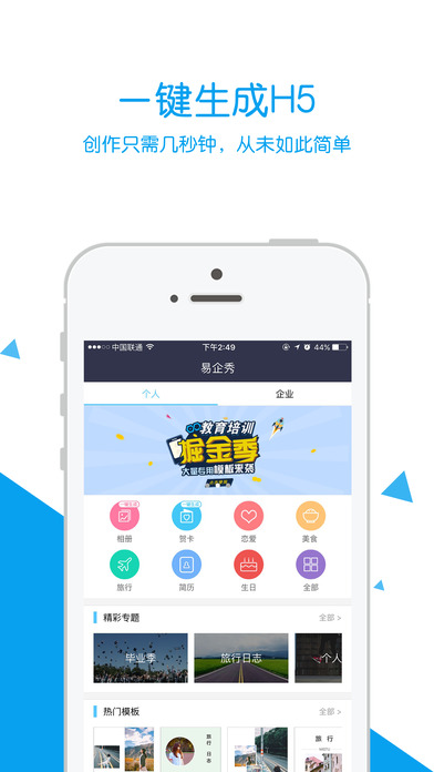 易企秀是一款针对移动互联网营销的手机网页DIY制作工具,我们允许易企秀用户编辑手机网页,分享到社交网络,进而通过表单收集潜在客户或其他反馈信息。