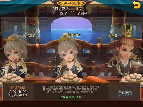 一尊高耸入云的武神雕像,你便知这是玩家角逐武神名号的地方——“英雄榜”,各方宝座胜者上败者下,荣誉一目彰显;进入“夺宝奇兵”玩法你就会看到如此界面——汪洋大海,商资船舶靠岸停泊,显而易见,这是聚结各方人士抢夺财富的不二之地;大鱼大肉,山珍海味,饕餮盛宴就在“满汉全席”,到中饭和晚饭时间,别忘来此大快朵颐,恢复体力。