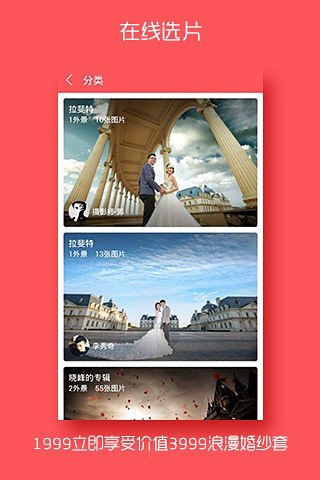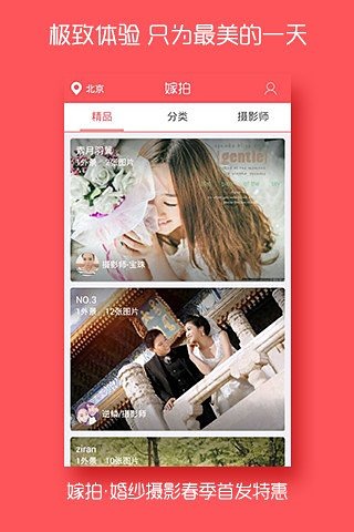 嫁拍-婚纱摄影,新人口碑拍婚纱必选。嫁拍解决新人拍婚纱照的一切难题,专属摄影师、化妆师全程服务。实现新人在线选片、精修,选框制作、付费等一站式服务,为用户提供更好、更高效、更节省开销的全新体验。嫁拍-婚纱摄影,是唯一一家能提供全套婚纱摄影解决方案的app。赏析、订购、选片、分享、互动,新人随时随地尽享“指尖”上的婚纱照。