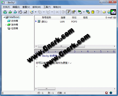 Becky! Internet Mail是优秀的邮件软件之一,支持多个信箱,Voice Mail功能、信件过滤器、定时提醒,支持HTML格式邮件,还能让你直接删除或选择性的下载远端服务器上的邮件,完全支持双字节内码,经过设置可以在不外挂任何多内码语言支持软件的情况下看繁体信件(但需安装微软的繁体语言支持包),还有非常方便的PGP加密支持,编辑界面及操类似WORD。