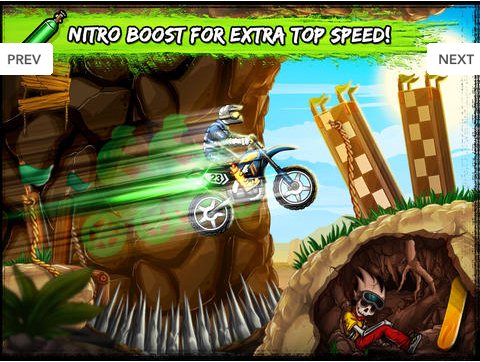游戏玩法非常简单,因为这款游戏所使用的是重力感应加上手指触控的操作模式,你需要倾斜设备来控制摩托车的倾斜方向,手指点击屏幕会让摩托车加速前进。游戏玩法虽然经典,不过游戏关卡设置和玩法都得到了非常大的升级。让你意识到这并不是一味的按油门就能过关的简单游戏。你还能通过摩托车来一个空中的自由的翱翔!或许前一秒你通过了一座桥,下一秒那座桥却已灰飞烟灭。动心了吗?快来开启你的大冒险之旅吧!