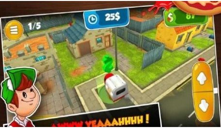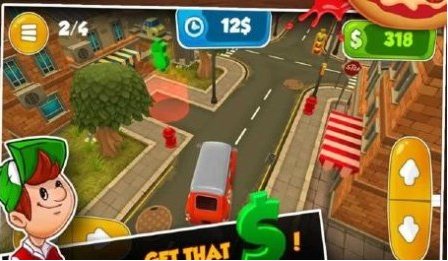 游戏采用了关卡挑战模式,每一个关卡我们都要完成一定的任务,在固定的时间内送完所有的货才行。游戏地图上会有很多绿色的金钱标志,这些就是点外卖的买家,我们要跟着头顶披萨的指示方向前进,寻找到买家,然后一手交钱一手交货,但是时间的限制是非常困难的挑战,玩家们要尽快完成所有外卖业务才能获得更高的积分。
