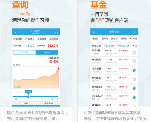1、基金:可方便查询华安旗下基金基本信息、净值、过往业绩表现及投资组合情况。2、交易:支持基金买卖、转换、定期定额、预约交易等主要交易功能。