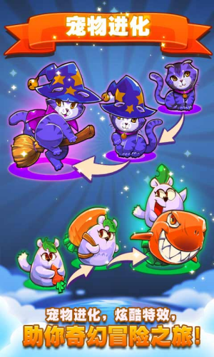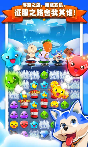 《庚宠兵团》游戏轻松绚丽的游戏主界面,带给玩家一种轻松的感觉。画面中,浮于天空中的小山小建筑很好的连接了各个关卡,场景光影有致,精致的细节、浮动的云朵、根据手指滑动而移动的3D画面,精美的画面表现,在消除类休闲手游中并不多见。