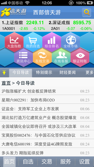 西部信天游手机版特点为: 行情揭示全面:支持沪深股票、期货、基金、外盘港股、全球指数等;资讯内容丰富:港澳资讯包括明日提示、证券要闻、主力追踪、公司公告等;使用操作便捷:依据Iphone手机量身定做,重力感应分时走势、K线切换;交易功能全面:支持A、B股、封闭式基金、开放式基金、国债交易,银证转帐轻松搞定;运行稳定高效:卫星行情直达,行情数据实时同步刷新;先进的交易服务器保障,成交快人一步。【更新日志】