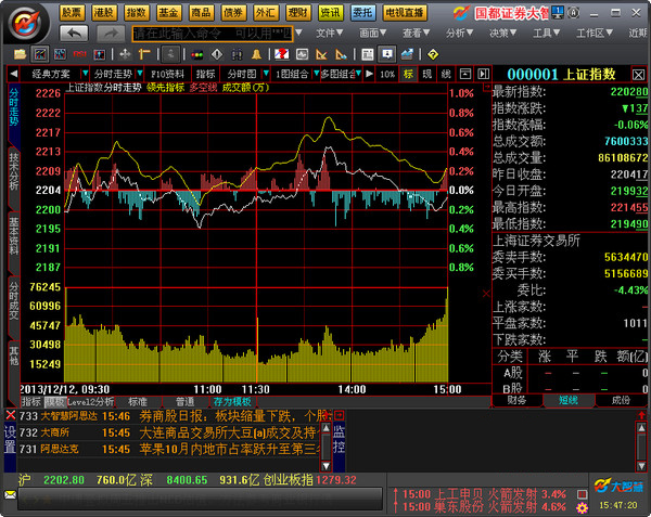 国都证券大智慧证券信息平台是一套用来进行行情下载显示、行情下载分析并同时进行信息即时下载接收的超级证券信息平台。传统界面和操作习惯,不用学习就能上手,而且不需要特别维护。国都证券大智慧软件信息资讯功能强大,实时提供"万国测评"等投资建议,内置国都证券委托下单程序;证券分析直观实用,包含了当前大部分证券投资分析工具的实用功能;新增外汇行情、基金及荐股平台、三板行情、短线精灵等功能,运行更稳定,使用更方便。