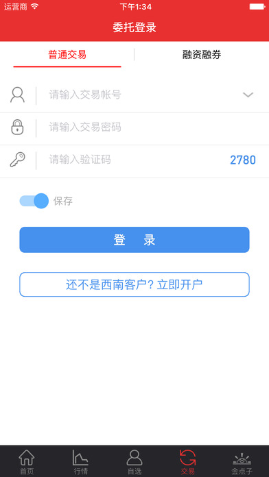 1、西南用户登录,支持普通交易和信用交易。输入账号,交易密码和验证码进行登录。