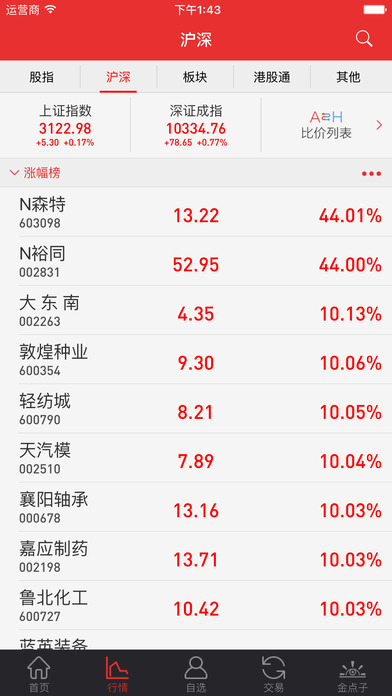 从首页点击 "涨跌排名"默认进入沪深排名榜;向右滑可以进入股指,向左滑进入行业板块,其他;上下滑动查看更多股票。