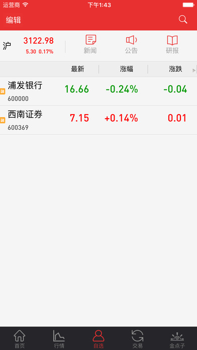 西南金点子手机版让您投资省时、贴心、方便!金点子咨询,客户服务,自选股查询,行情查询,委托交易,资讯浏览,持仓查询!实时行情+技术分析:实施行情报价,提供日、周、月K线等分析周期,提供成交量等分析指标。 在线交易:提供买、卖、撤单、查询等网上交易系统所具备的全部交易功能,更支持开放式基金,融资融券,双喜增利等功能。 还有金点子资讯:提供丰富的资讯信息和股票公告,及西南专业研究资料。【软件特点】