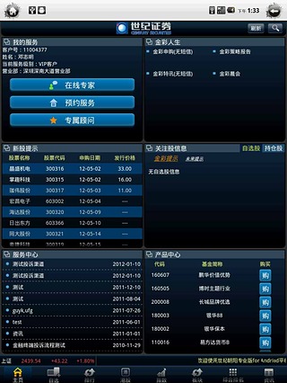 客户端只能在安卓(Andriod)系统的平板电脑上安装使用。提供最及时的沪深港行情和专业丰富的财经资讯以及在线咨询服务;支持"level-2"行情;沪深市场委托、新股申购、银证转账、基金申购等。世纪证券前身是江西证券,是在中国人民银行和中国证监会的直接领导下重组而成的一家全国性综合类证券公司,由北京首都旅游集团有限责任公司等12家颇具实力和社会影响力的大型企业出资成立。公司总部设在深圳,注册资金10.05亿元人民币,下辖北京、上海、深圳、成都、南昌5个业务总部,拥有21家营业部,经营网络遍布全国各大、中城市。