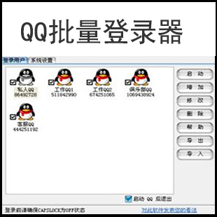 欢迎使用QQ批量登录功能,也可以称为一键QQ登录,主要是为了解决用户在日常登录用户时需要频繁输入用户名和密码的繁琐操作从而一键解决QQ登录问题。QQ批量登陆的功能是通过老黄牛营销平台一键下来的绿的版本,当软件升级的时候都会自动弹出更新!打开软件运行QQ批量登录界面,如果是少量QQ,用户可以在左上角的用户密码框填写QQ信息然后单击添加,添加后的QQ目录会自动显示在下面的菜单中,如果用户有大量的QQ需要登录时可以选择批量导入导出功能,导出的文件用户合一自定义名称,文件内部的QQ号和密码以默认为=(等于号)分隔以便于本软件区分,用户也可以在文件中手动编辑号码簿,中间以=号分隔即可。本软件还可以根据用户的需求任意选择想要退出的QQ或者全部退出,注:本软件不同于QQ挂机软件,如果想了解批量挂机的使用说明,请到挂机软件的栏目中下载!