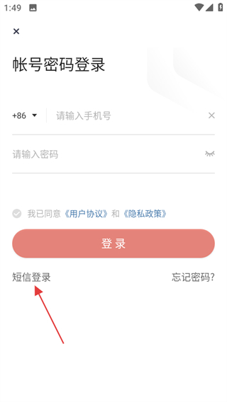 3、于登录页面,点击“短信登录”,即可进入短信验证码登录页面。