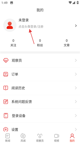 1. 进入观察者网,点击页面右下角“我的”选项,即可进入个人中心页面。
