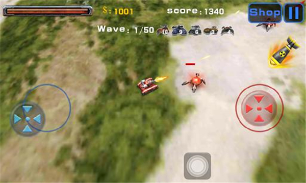 《坦克大战3DTankWorldWar3D》:是一款备受瞩目的经典坦克题材游戏。3D画面、多样的坦克养成、简单又刺激的战斗方式以及独特创新的任务模式;再配合逼真的战斗爆炸音效,绝对会带给您视觉和听觉的双重享受。游戏共有50大关,丰富的游戏元素,让您玩个痛快。游戏的操作相对也比较简单,坦克会自动攻击,通过右边的红色方向键可以手动控制炮台的方向,而位于游戏界面左边的蓝色方向键则是用来控制坦克移动的方向。游戏道具的使用直接点选战场掉落的道具,直接控制坦克移动过去就能获取。重拳打造,经典震撼登场,只有您想不到,没有我们做不到!