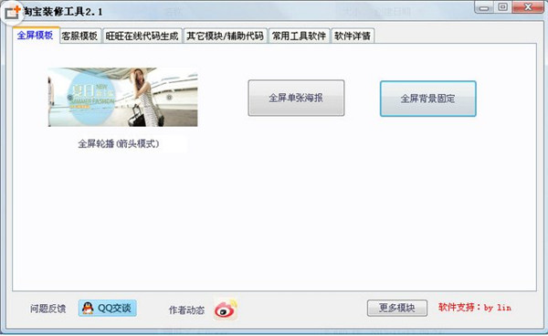 淘宝装修工具(免费装修淘宝店铺) v2.1 免费版 淘宝装修工具是一款免费的淘宝店铺装修软件,它可以帮你在线生成淘宝店装修代码,让你的淘宝店铺看起来更加美观,它具有全屏海报轮播、全屏单张海报、全屏背景固定、客服模板生成、旺旺代码生成、特效模板生成等功能,帮助您快捷高效的完成网店设计,是商家和美工们追逐的神器。