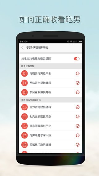 1、新增专题奔跑吧兄弟订阅频道,让你一键订阅就可轻松获取所有关于跑男节目及主演嘉宾的动态。添加的一键订阅功能按钮,一键关注所有关于跑男的彩蛋提醒、收看提醒、微博动态提醒,当然你也可以取消你不想要的提醒,剩下来的就全部是你的菜了,不过我想作为跑男粉的你一定不舍得漏掉任何一个提醒的。