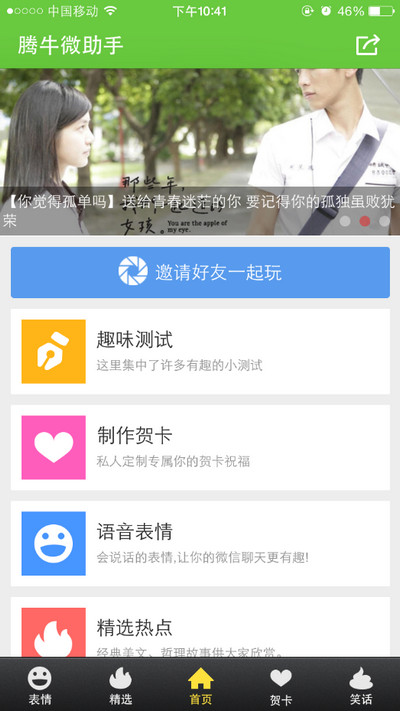腾牛微助手App有五大主打功能,趣味测试题、个性化私人贺卡、语音和表情、精选热点美文、以及糗事笑话大全,内置各种搞笑、雷囧、精彩段子让你轻松玩转朋友,号称段子手哦!还有大量精彩图片,你就是朋友圈的表情帝。