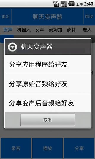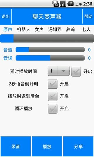 聊天变声器是一款支持微信变声以及各种声音效果变化的声音处理软件,包含系统预定义的汤姆猫、男声、女声、老人、机器人等效果,还支持用户自定义切换各种声音效果,并可以通过QQ、邮件等方式将变声后的音频共享给好友,更重要的是它支持通过微信语音发送变声后的声音。 最新5.0版本更新内容: 1.解决部分手机因为录音参数问题导致无法录制或播放问题 2.解决实时变声不及时问题,现在可以随时切换声音效果参数,做到真正及时响应! 声明:本软件仅供娱乐,请勿用于任何违法犯罪活动【更新日志】