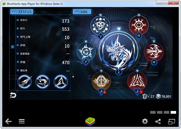 在选择关卡界面,我们可以点击ARK系统,来查询我们的状态,包括等级、攻击力、血量护甲等等。