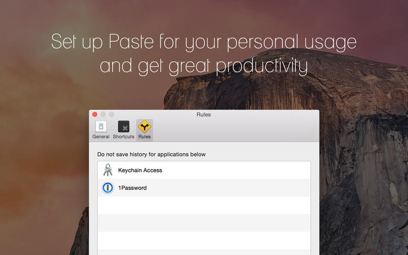 Paste for mac集合了 OS X / iOS 两个平台的优秀特质,如:剪切板记录(Clipboard History)采用了 iOS 多任务卡片切换界面,剪切板搜索(Search)明显借鉴了 OS X Launchpad 中 App 搜索 UI,虽说是模仿,但放在剪切板功能管理上恰到好处,配合热键快速调用,使用起来更是得心应手。单击 Clipboard 记录可执行拷贝动作,对于文字我们可以选择自动清除源内容样式,并且在后台可自定义 Clipbaord History 显示的容量,从 10,50,100,500,甚至是无限量都可以选择。