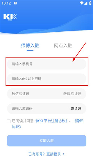 3、进入师傅入驻注册页面后,填入手机号以及长度超过6位的密码,接着点击下一步。