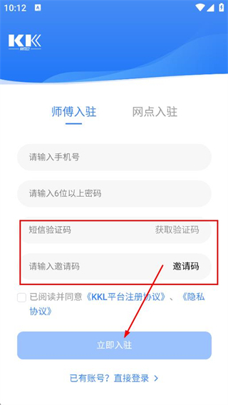 4、填入短信验证码与邀请码,勾选同意协议,随后点击“立即入驻”,即可完成账号注册流程。