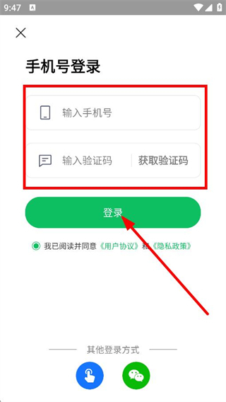 4、于手机号登录界面,填入手机号及验证码,点击“登录”按钮,即可完成账号登录操作。