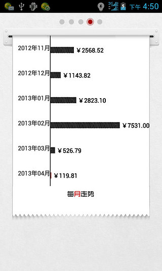 2、主界面很简洁,以收银台中的收银纸的方式列出之前记录的账目。下拉收银纸就可以看到之前的账目。