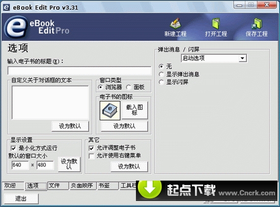 eBook Edit Pro V3.31 汉化绿色特别版 该软件是典型的将HTML页面文件(包括媒体文件)捆绑成EXE电子文档的制作软件。软件支持大多数基于Web的技术,其主要特点如下:1.自定义窗口标题;2.启动时弹出信息窗口;3.图标式的导航条(真彩);4.支持使用自定义文件图标(唯一一款支持使用32*32,256色的软件);5.支持文字自动换行;6.含有改变文字大小功能的图形按钮;7.支持右键菜单(可以屏蔽)。