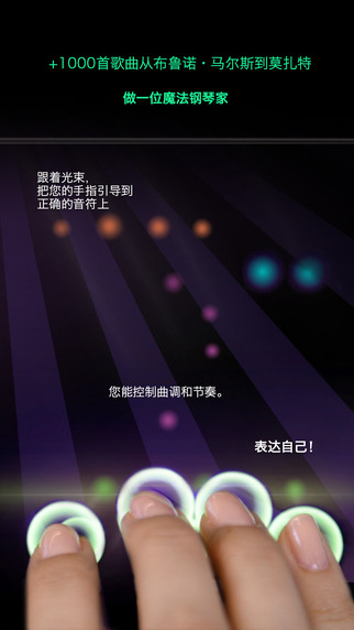 MagicPiano有轻松挑选和演奏功能,让您随时随地展现出钢琴天才的气质。按照您自己的风格演奏您最喜爱的乐曲,并且每次都能演奏出美妙的音乐。您跟随光束,引导您的指尖触按正确的音键;您可以自己控制音键、节奏和节拍,让您的创造力和表现力绽放光彩。