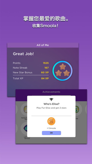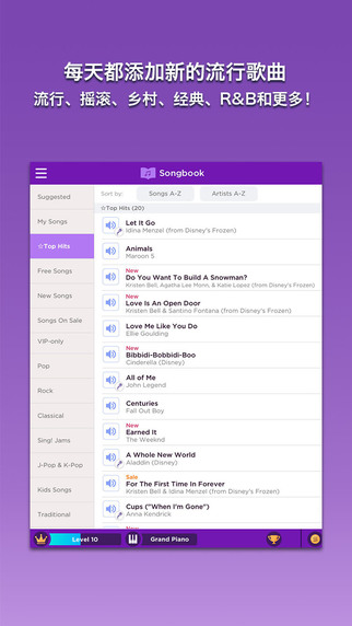 MagicPianobySmule拥有超过500首乐曲的曲库,并且每周都会增加新的乐曲;还提供所有钢琴应用程序中最大的乐曲目录供您选择。该应用程序会定期增加热门排行新歌,玩家可以不时查阅新发布的乐曲和每天一首的免费乐曲!玩家还可通过演奏和观看视频赢得新的乐曲。MagicPianobySmule当前提供的乐曲包括流行、摇滚、古典、电影和音乐剧等。