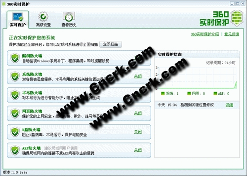 360安全卫士6.1版隆重推出系统防火墙2.0!结合了革命性的云查杀引擎,在强大的云计算中心的支持下,系统防火墙2.0针对容易被木马等恶意软件利用的系统关键位置,对系统进行实时的智能监控,最大限度的保证系统的稳定,保护用户的安全!