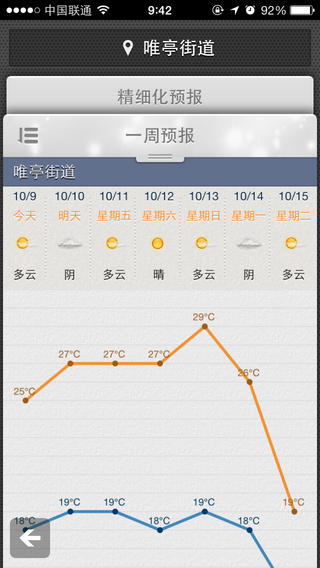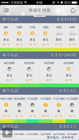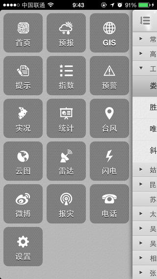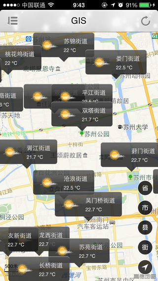天气预报、预警: 根据定位信息支持苏州全区精细到街道、乡镇的3-7天天气预报的文字、图形、曲线显示; 支持苏州全区气象预警信号的精准发布; 支持全国2000多个区县以上城市3-7天天气预报的收藏定制, 通过首页滑屏方便快捷地显示用户定制城市的天气预报文字、图形、曲线等。天气实况: 支持程序使用者当前所处位置的气象实况资料(气温、雨量、风况、湿度、气压)的显示, 支持苏州全区气象实况资料的图形化显示和对比;支持江苏及周边省市(目前为江、浙、沪、皖)的天气实况资料显示。