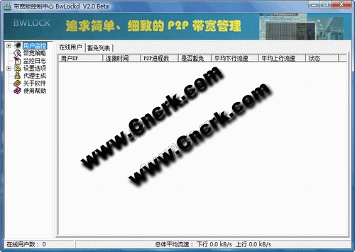 带宽锁(BwLock)V2.0是基于服务器-客户机模式的网络带宽管理软件。客户端代理模块可以控制客户机的全局上传、下载带宽(流速),并且能单独对P2P应用进程限速。服务端监视客户机的平均流速,提供带宽策略修改界面,记录监控日志。