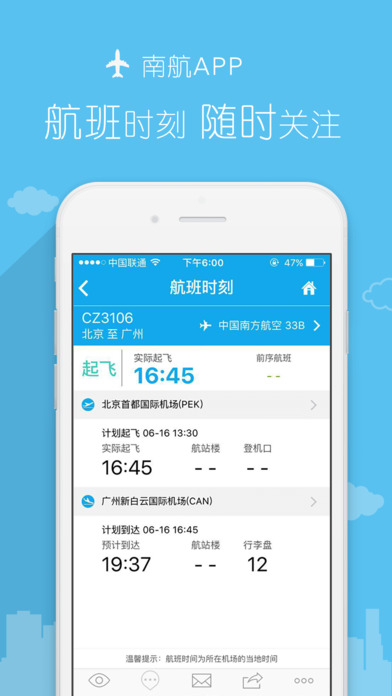 南方航空IOS客户端这是南航为南航用户们推出的一个集合机票预订、行程管理、手机值机、会员管理、客票验真、航班动态等功能于一体方便而好用的手机应用。南方航空app支持南航国内、国际机票的在线预订与支付可以随时随地查看您的订单并可在线申请机票退改,同时支持用户选择机上座位、办理登机手续,及多种支付方式。提供了里程查询、客票验真、航班动态、免票兑换、出行向导等贴心服务,方便快捷,安全易操作,让南航的五星级服务真正常驻您的身边。【特点】