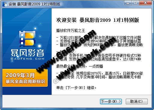暴风影音2009 1对1特别版 V3.09.03.30 简体中文官方安装版 ·更换了暴风影音新标识,增加了暴风影音开启动画